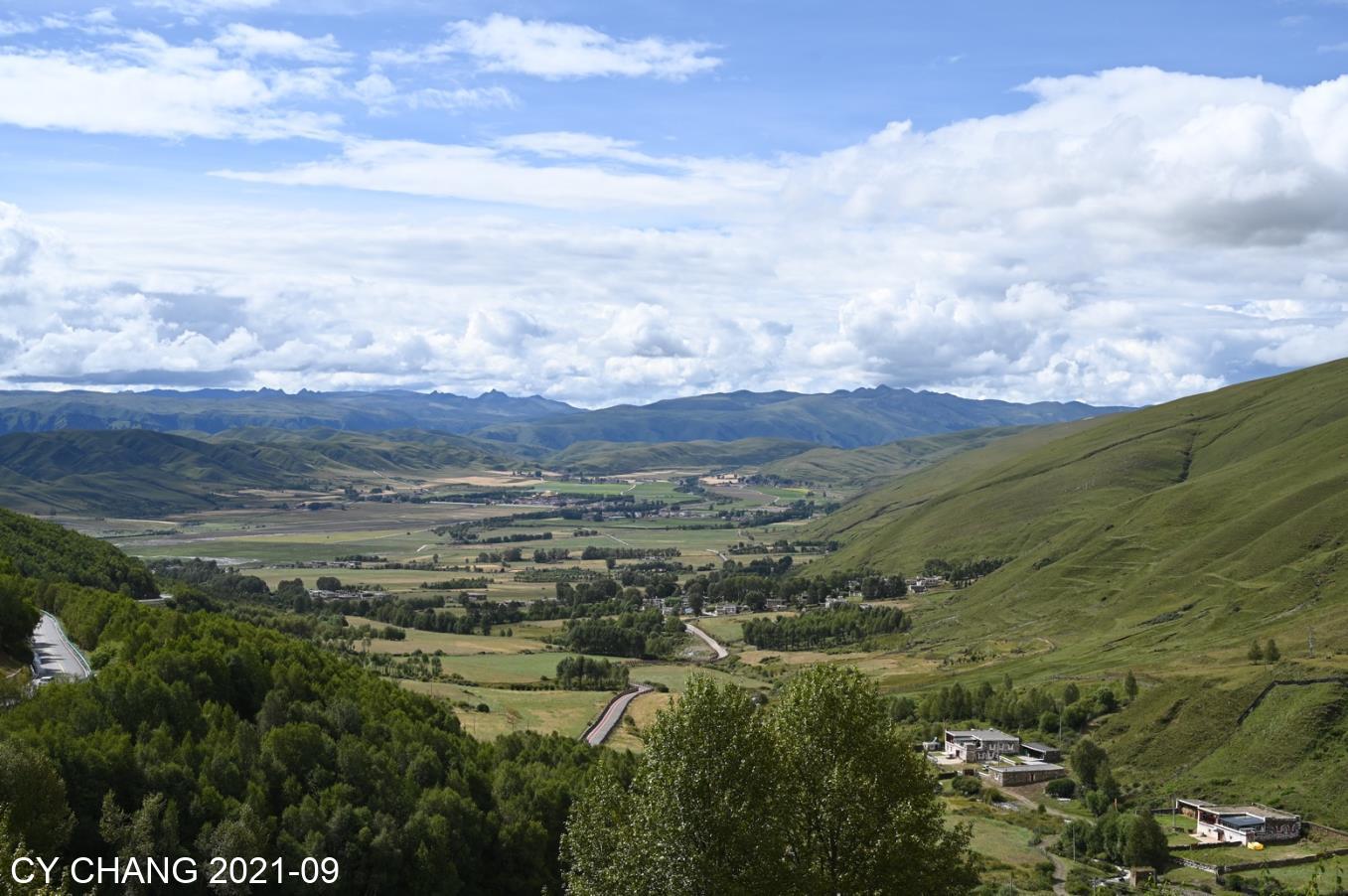 Meandering over one mountain after another. I saw a beautiful valley in this corner and stopped to take a few more pictures. The clouds, blue sky and green land in the distance. It is rare to have such a beautiful place. Peaceful.