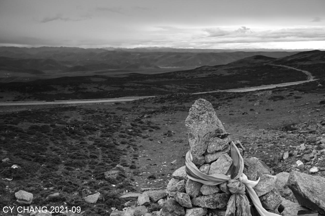 The lonely pile of stones, tied with cloth strips, prayed for blessings. The lake it saw for thousands of years has grown bigger and the road has become better.